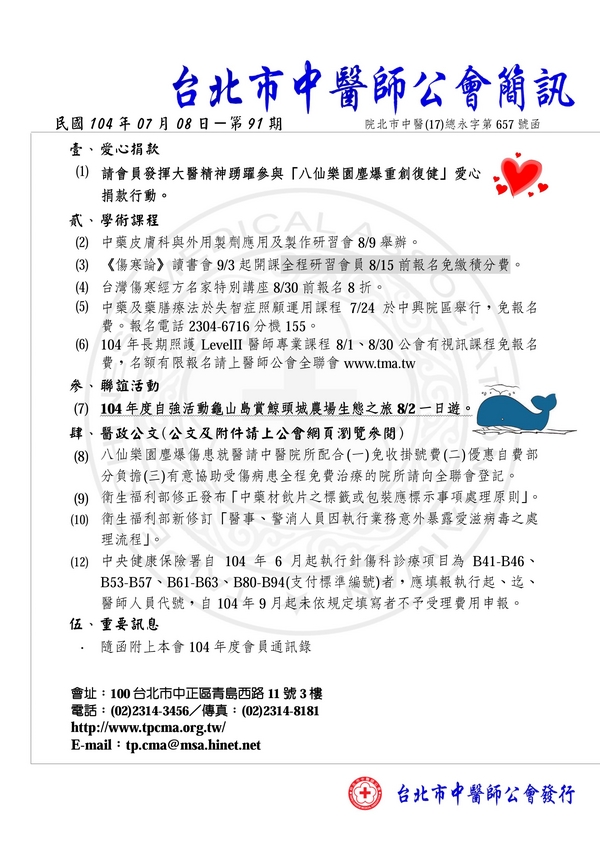 | 台北市中醫師公會 官網:http://www.tpcma.org.tw 地址:台北市中正區青島西路11號3樓 E-mail:tp.cma@msa.hinet.net 電話:(02)2314-3456(代表號) 傳真:(02)2314-8181 |