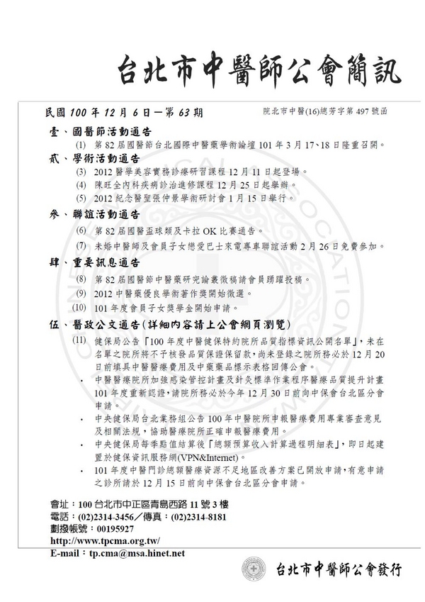 | 台北市中醫師公會 官網:http://www.tpcma.org.tw 地址:台北市中正區青島西路11號3樓 E-mail:tp.cma@msa.hinet.net 電話:(02)2314-3456(代表號) 傳真:(02)2314-8181 |