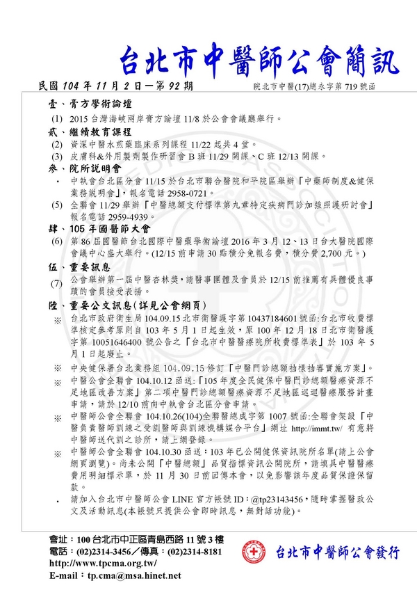 | 台北市中醫師公會 官網:http://www.tpcma.org.tw 地址:台北市中正區青島西路11號3樓 E-mail:tp.cma@msa.hinet.net 電話:(02)2314-3456(代表號) 傳真:(02)2314-8181 |