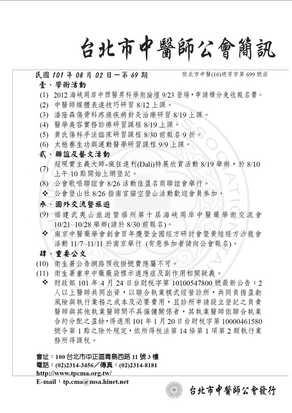 | 台北市中醫師公會 官網:http://www.tpcma.org.tw 地址:台北市中正區青島西路11號3樓 E-mail:tp.cma@msa.hinet.net 電話:(02)2314-3456(代表號) 傳真:(02)2314-8181 |