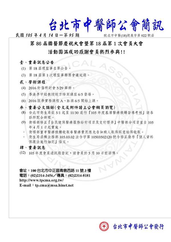 | 台北市中醫師公會 官網:http://www.tpcma.org.tw 地址:台北市中正區青島西路11號3樓 E-mail:tp.cma@msa.hinet.net 電話:(02)2314-3456(代表號) 傳真:(02)2314-8181 |