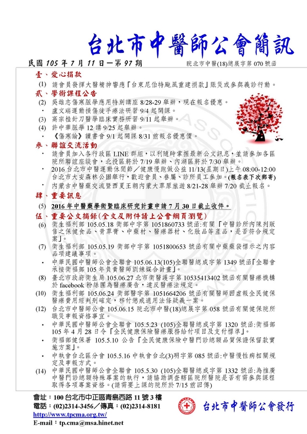 | 台北市中醫師公會 官網:http://www.tpcma.org.tw 地址:台北市中正區青島西路11號3樓 E-mail:tp.cma@msa.hinet.net 電話:(02)2314-3456(代表號) 傳真:(02)2314-8181 |