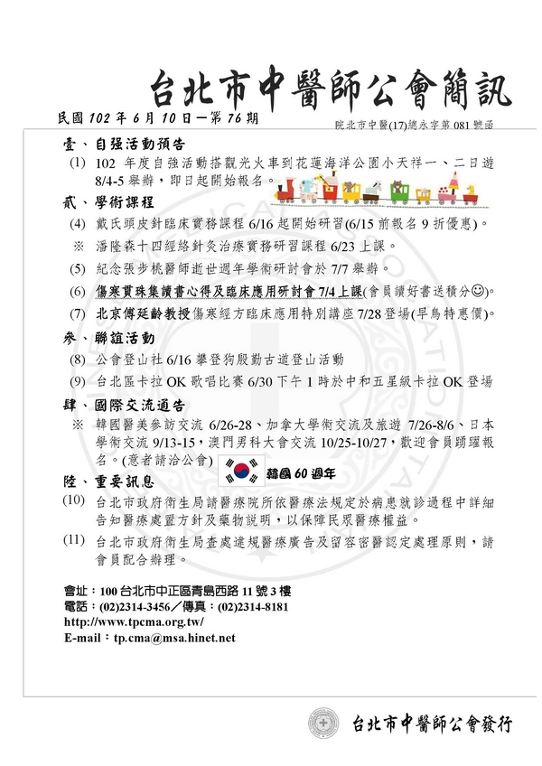 | 台北市中醫師公會 官網:http://www.tpcma.org.tw 地址:台北市中正區青島西路11號3樓 E-mail:tp.cma@msa.hinet.net 電話:(02)2314-3456(代表號) 傳真:(02)2314-8181 |