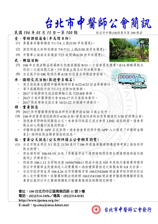 | 台北市中醫師公會 官網:http://www.tpcma.org.tw 地址:台北市中正區青島西路11號3樓 E-mail:tp.cma@msa.hinet.net 電話:(02)2314-3456(代表號) 傳真:(02)2314-8181 |