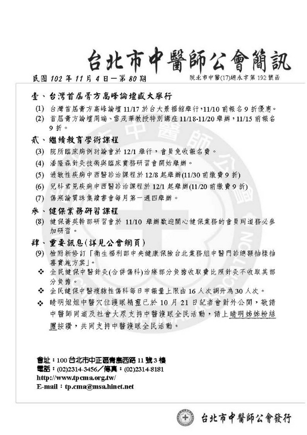 | 台北市中醫師公會 官網:http://www.tpcma.org.tw 地址:台北市中正區青島西路11號3樓 E-mail:tp.cma@msa.hinet.net 電話:(02)2314-3456(代表號) 傳真:(02)2314-8181 |