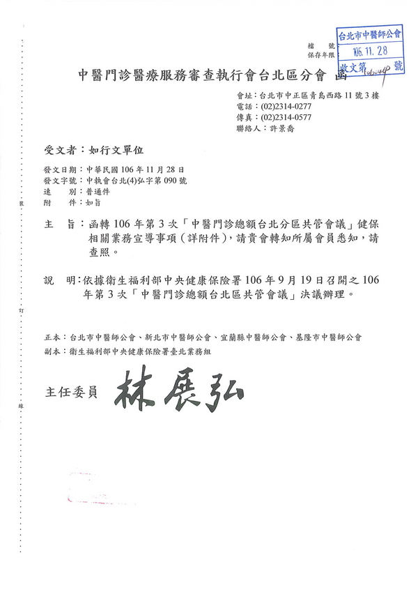 | 台北市中醫師公會 官網:http://www.tpcma.org.tw 地址:台北市中正區青島西路11號3樓 E-mail:tp.cma@msa.hinet.net 電話:(02)2314-3456(代表號) 傳真:(02)2314-8181 |