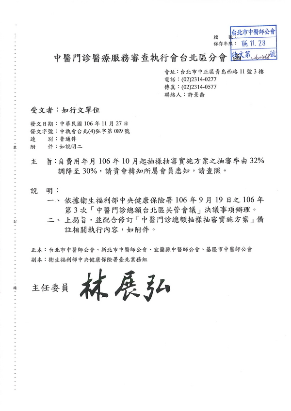 | 台北市中醫師公會 官網:http://www.tpcma.org.tw 地址:台北市中正區青島西路11號3樓 E-mail:tp.cma@msa.hinet.net 電話:(02)2314-3456(代表號) 傳真:(02)2314-8181 |
