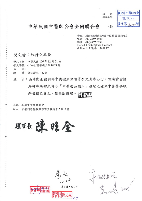 | 台北市中醫師公會 官網:http://www.tpcma.org.tw 地址:台北市中正區青島西路11號3樓 E-mail:tp.cma@msa.hinet.net 電話:(02)2314-3456(代表號) 傳真:(02)2314-8181 |