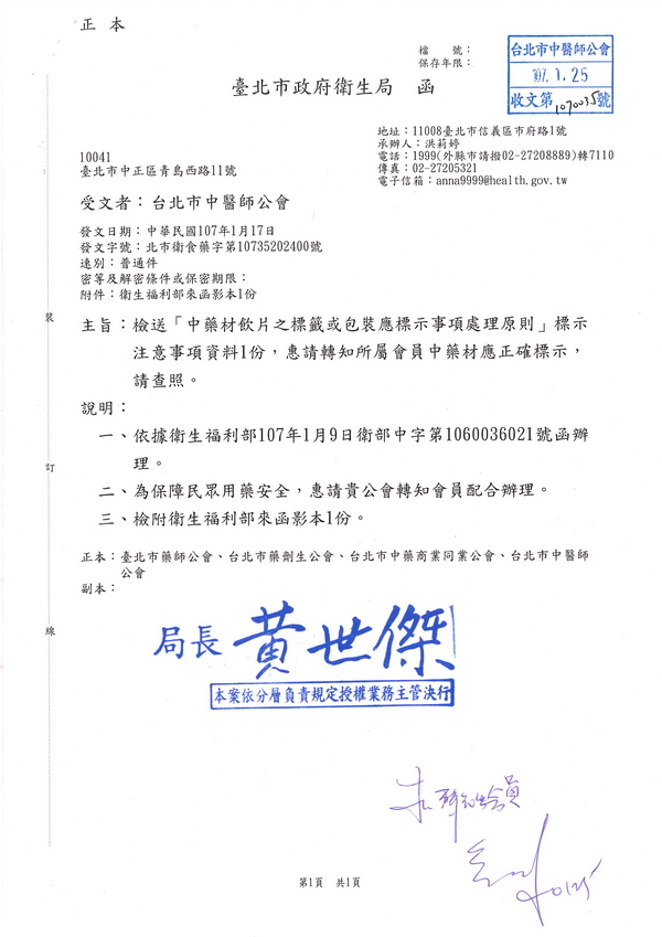 | 台北市中醫師公會 官網:http://www.tpcma.org.tw 地址:台北市中正區青島西路11號3樓 E-mail:tp.cma@msa.hinet.net 電話:(02)2314-3456(代表號) 傳真:(02)2314-8181 |
