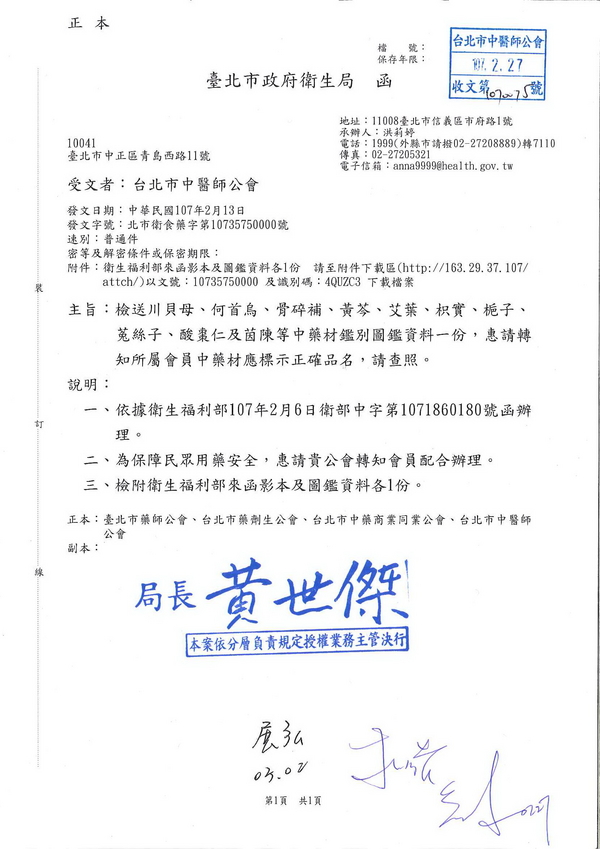 | 台北市中醫師公會 官網:http://www.tpcma.org.tw 地址:台北市中正區青島西路11號3樓 E-mail:tp.cma@msa.hinet.net 電話:(02)2314-3456(代表號) 傳真:(02)2314-8181 |