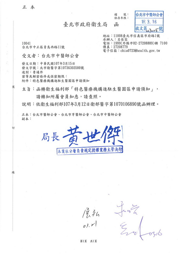 | 台北市中醫師公會 官網:http://www.tpcma.org.tw 地址:台北市中正區青島西路11號3樓 E-mail:tp.cma@msa.hinet.net 電話:(02)2314-3456(代表號) 傳真:(02)2314-8181 |