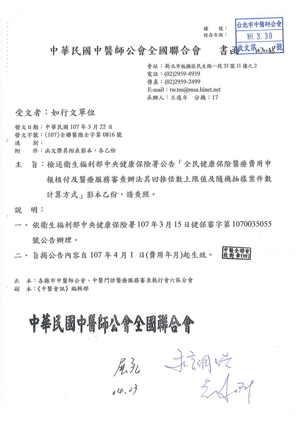 | 台北市中醫師公會 官網:http://www.tpcma.org.tw 地址:台北市中正區青島西路11號3樓 E-mail:tp.cma@msa.hinet.net 電話:(02)2314-3456(代表號) 傳真:(02)2314-8181 |