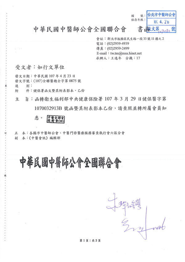 | 台北市中醫師公會 官網:http://www.tpcma.org.tw 地址:台北市中正區青島西路11號3樓 E-mail:tp.cma@msa.hinet.net 電話:(02)2314-3456(代表號) 傳真:(02)2314-8181 |