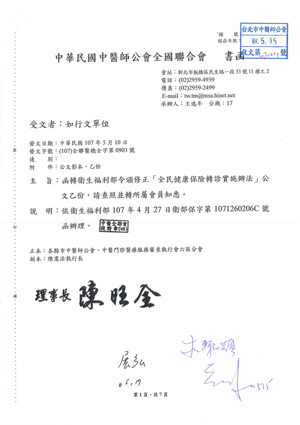 | 台北市中醫師公會 官網:http://www.tpcma.org.tw 地址:台北市中正區青島西路11號3樓 E-mail:tp.cma@msa.hinet.net 電話:(02)2314-3456(代表號) 傳真:(02)2314-8181 |