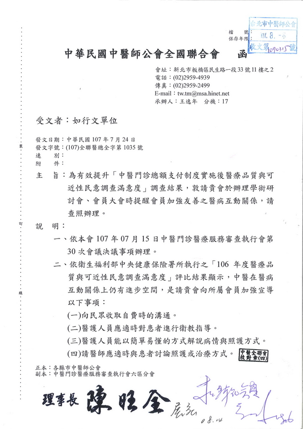 | 台北市中醫師公會 官網:http://www.tpcma.org.tw 地址:台北市中正區青島西路11號3樓 E-mail:tp.cma@msa.hinet.net 電話:(02)2314-3456(代表號) 傳真:(02)2314-8181 |
