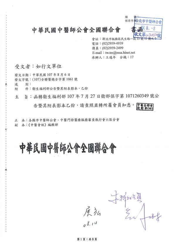 | 台北市中醫師公會 官網:http://www.tpcma.org.tw 地址:台北市中正區青島西路11號3樓 E-mail:tp.cma@msa.hinet.net 電話:(02)2314-3456(代表號) 傳真:(02)2314-8181 |