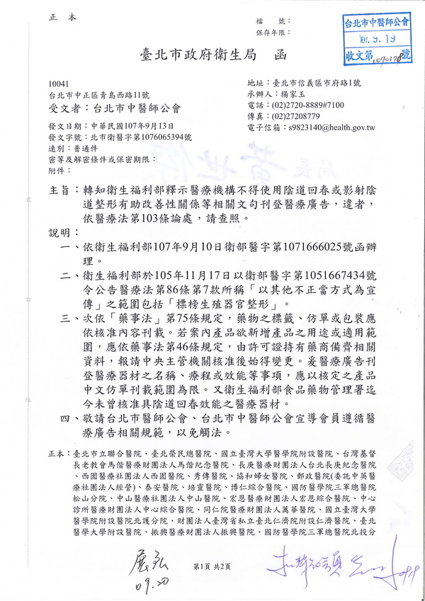 | 台北市中醫師公會 官網:http://www.tpcma.org.tw 地址:台北市中正區青島西路11號3樓 E-mail:tp.cma@msa.hinet.net 電話:(02)2314-3456(代表號) 傳真:(02)2314-8181 |