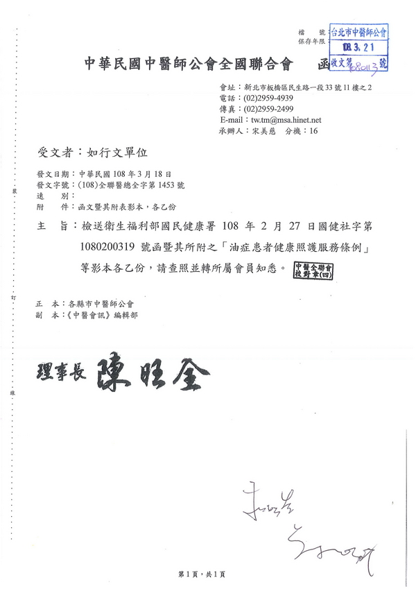 | 台北市中醫師公會 官網:http://www.tpcma.org.tw 地址:台北市中正區青島西路11號3樓 E-mail:tp.cma@msa.hinet.net 電話:(02)2314-3456(代表號) 傳真:(02)2314-8181 |