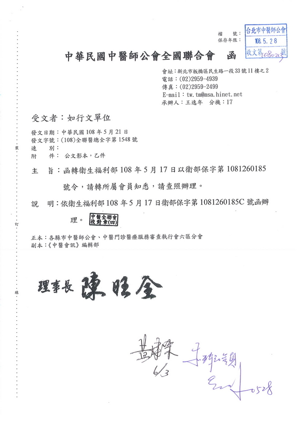 | 台北市中醫師公會 官網:http://www.tpcma.org.tw 地址:台北市中正區青島西路11號3樓 E-mail:tp.cma@msa.hinet.net 電話:(02)2314-3456(代表號) 傳真:(02)2314-8181 |
