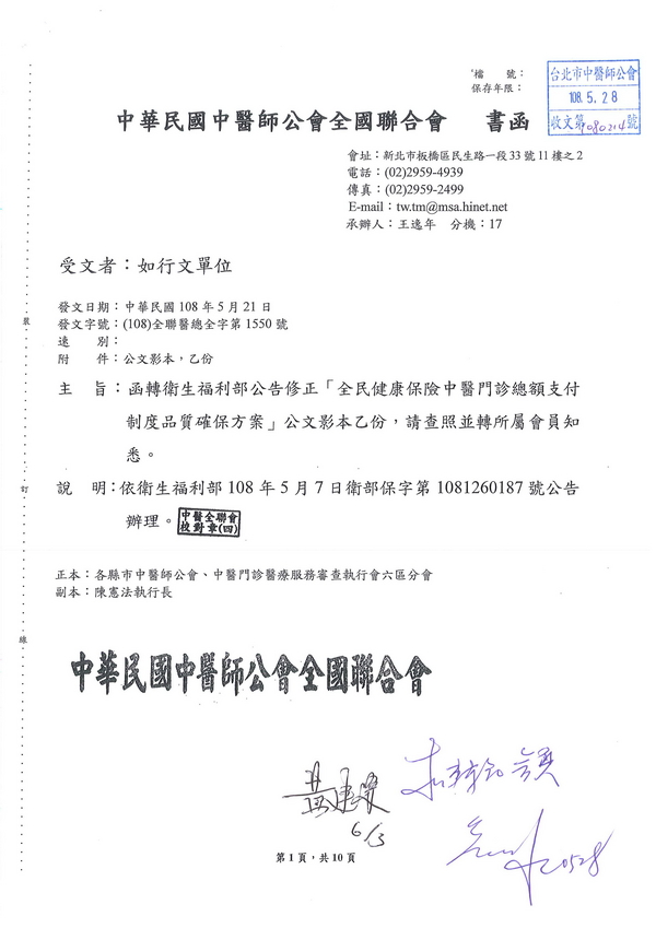 | 台北市中醫師公會 官網:http://www.tpcma.org.tw 地址:台北市中正區青島西路11號3樓 E-mail:tp.cma@msa.hinet.net 電話:(02)2314-3456(代表號) 傳真:(02)2314-8181 |