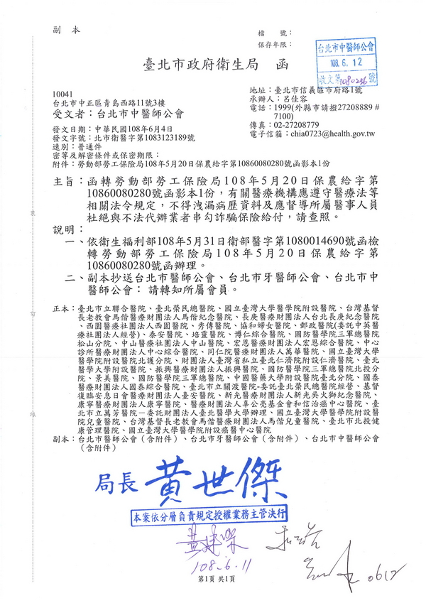 | 台北市中醫師公會 官網:http://www.tpcma.org.tw 地址:台北市中正區青島西路11號3樓 E-mail:tp.cma@msa.hinet.net 電話:(02)2314-3456(代表號) 傳真:(02)2314-8181 |