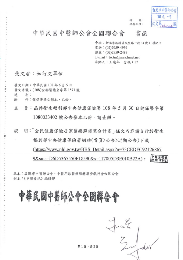 | 台北市中醫師公會 官網:http://www.tpcma.org.tw 地址:台北市中正區青島西路11號3樓 E-mail:tp.cma@msa.hinet.net 電話:(02)2314-3456(代表號) 傳真:(02)2314-8181 |