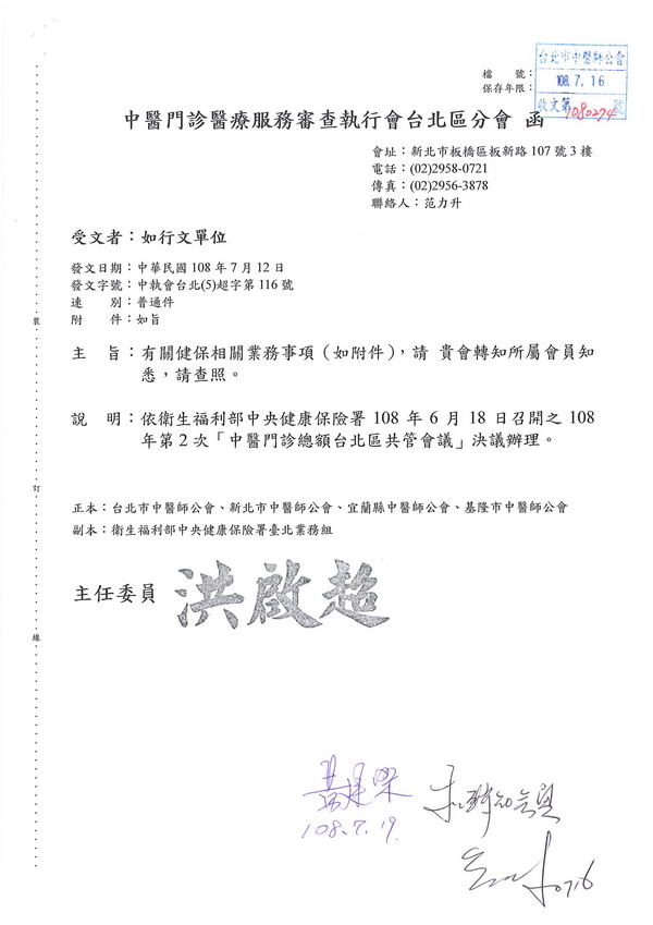 | 台北市中醫師公會 官網:http://www.tpcma.org.tw 地址:台北市中正區青島西路11號3樓 E-mail:tp.cma@msa.hinet.net 電話:(02)2314-3456(代表號) 傳真:(02)2314-8181 |