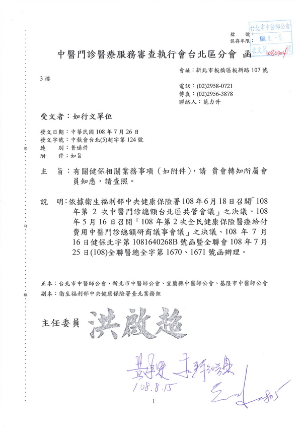 | 台北市中醫師公會 官網:http://www.tpcma.org.tw 地址:台北市中正區青島西路11號3樓 E-mail:tp.cma@msa.hinet.net 電話:(02)2314-3456(代表號) 傳真:(02)2314-8181 |