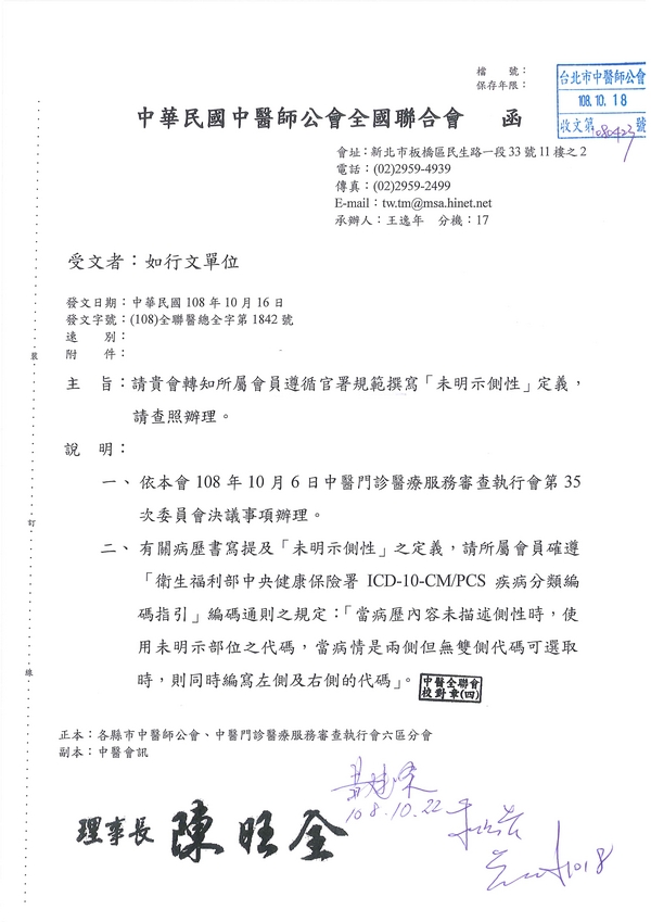 | 台北市中醫師公會 官網:http://www.tpcma.org.tw 地址:台北市中正區青島西路11號3樓 E-mail:tp.cma@msa.hinet.net 電話:(02)2314-3456(代表號) 傳真:(02)2314-8181 |