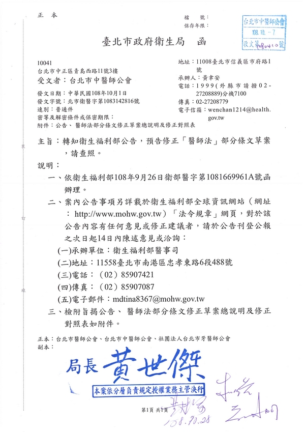 | 台北市中醫師公會 官網:http://www.tpcma.org.tw 地址:台北市中正區青島西路11號3樓 E-mail:tp.cma@msa.hinet.net 電話:(02)2314-3456(代表號) 傳真:(02)2314-8181 |