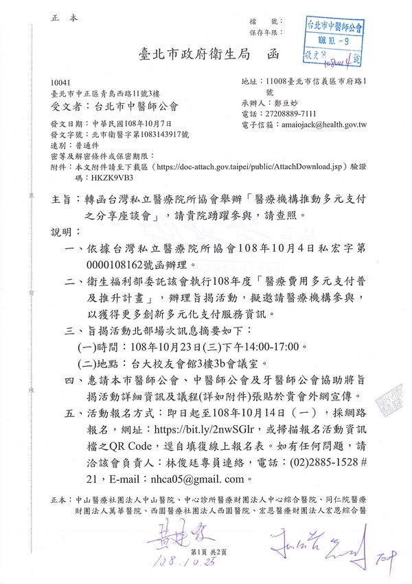 | 台北市中醫師公會 官網:http://www.tpcma.org.tw 地址:台北市中正區青島西路11號3樓 E-mail:tp.cma@msa.hinet.net 電話:(02)2314-3456(代表號) 傳真:(02)2314-8181 |