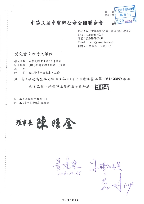 | 台北市中醫師公會 官網:http://www.tpcma.org.tw 地址:台北市中正區青島西路11號3樓 E-mail:tp.cma@msa.hinet.net 電話:(02)2314-3456(代表號) 傳真:(02)2314-8181 |