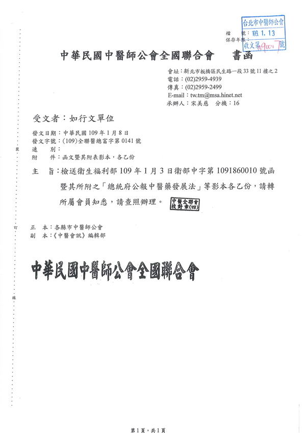 | 台北市中醫師公會 官網:http://www.tpcma.org.tw 地址:台北市中正區青島西路11號3樓 E-mail:tp.cma@msa.hinet.net 電話:(02)2314-3456(代表號) 傳真:(02)2314-8181 |