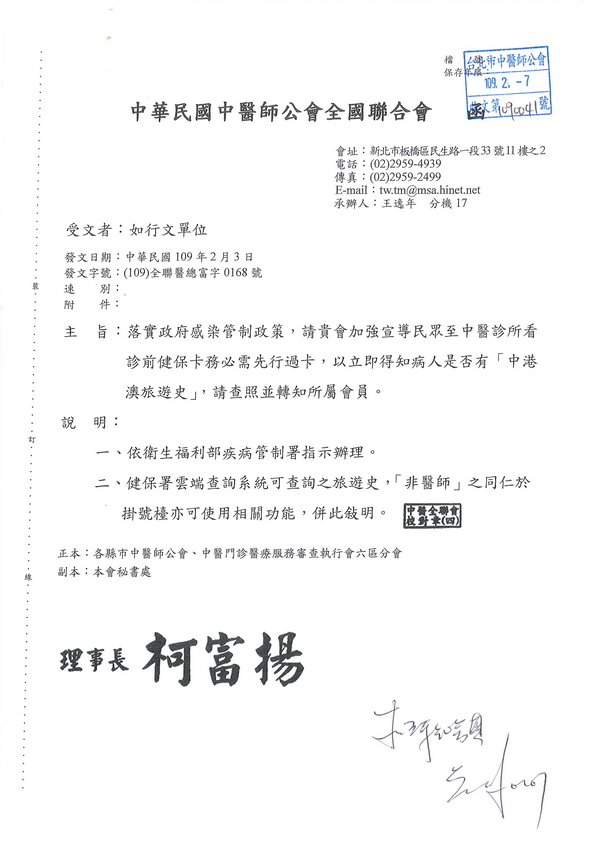 | 台北市中醫師公會 官網:http://www.tpcma.org.tw 地址:台北市中正區青島西路11號3樓 E-mail:tp.cma@msa.hinet.net 電話:(02)2314-3456(代表號) 傳真:(02)2314-8181 |