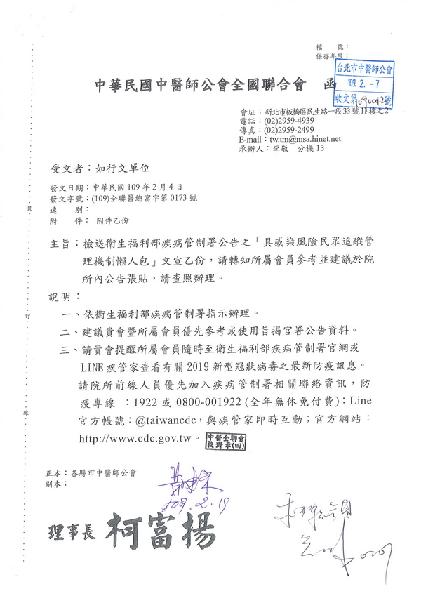 | 台北市中醫師公會 官網:http://www.tpcma.org.tw 地址:台北市中正區青島西路11號3樓 E-mail:tp.cma@msa.hinet.net 電話:(02)2314-3456(代表號) 傳真:(02)2314-8181 |