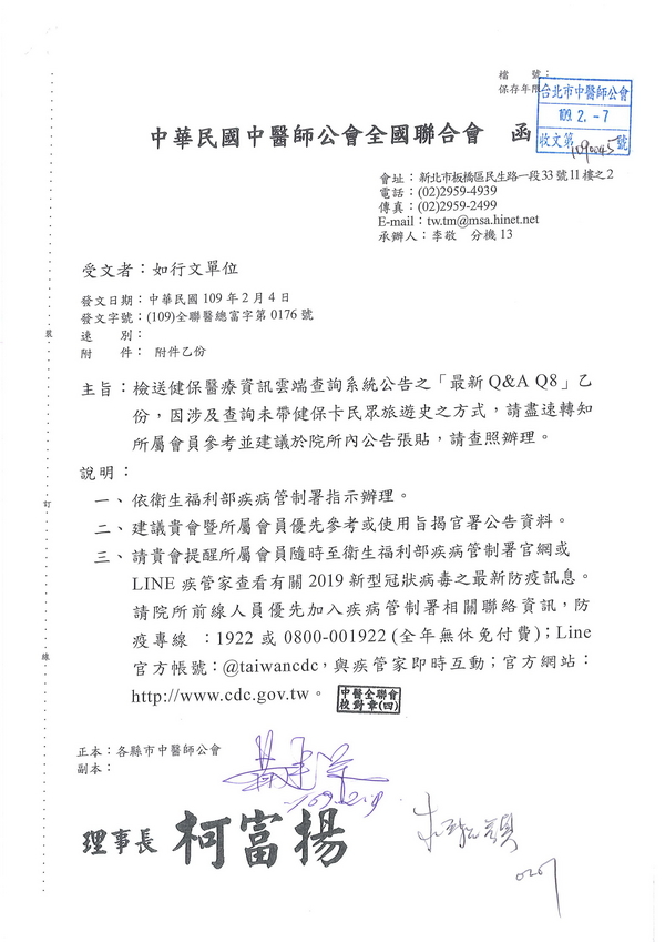 | 台北市中醫師公會 官網:http://www.tpcma.org.tw 地址:台北市中正區青島西路11號3樓 E-mail:tp.cma@msa.hinet.net 電話:(02)2314-3456(代表號) 傳真:(02)2314-8181 |