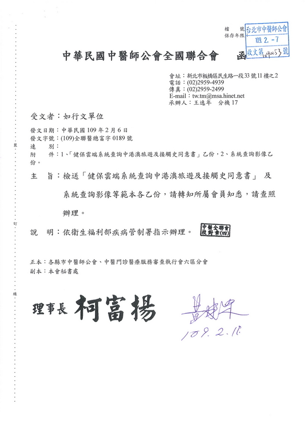 | 台北市中醫師公會 官網:http://www.tpcma.org.tw 地址:台北市中正區青島西路11號3樓 E-mail:tp.cma@msa.hinet.net 電話:(02)2314-3456(代表號) 傳真:(02)2314-8181 |