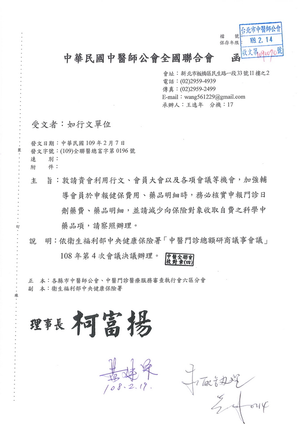 | 台北市中醫師公會 官網:http://www.tpcma.org.tw 地址:台北市中正區青島西路11號3樓 E-mail:tp.cma@msa.hinet.net 電話:(02)2314-3456(代表號) 傳真:(02)2314-8181 |
