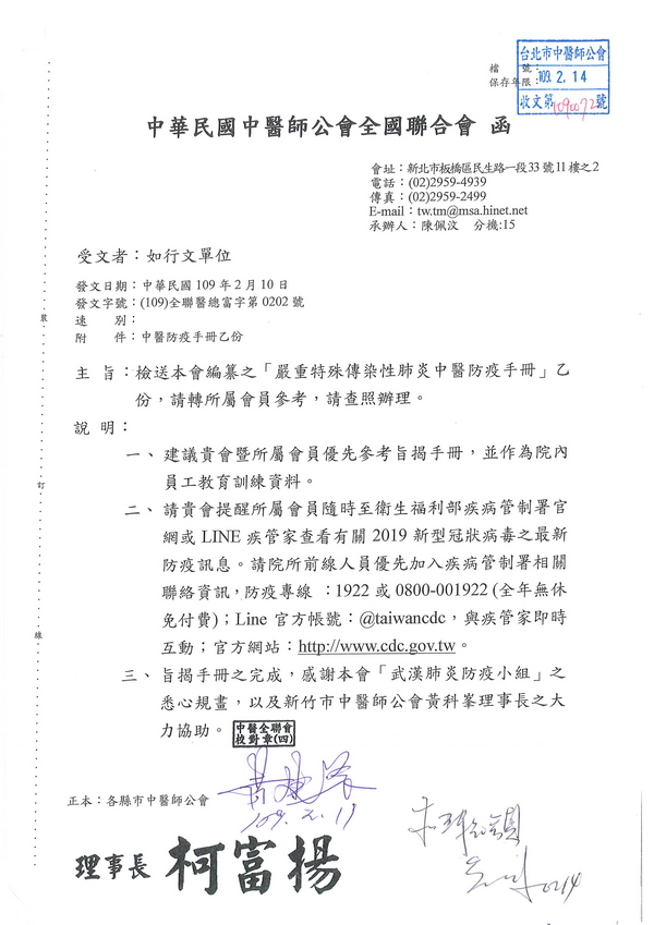 | 台北市中醫師公會 官網:http://www.tpcma.org.tw 地址:台北市中正區青島西路11號3樓 E-mail:tp.cma@msa.hinet.net 電話:(02)2314-3456(代表號) 傳真:(02)2314-8181 |