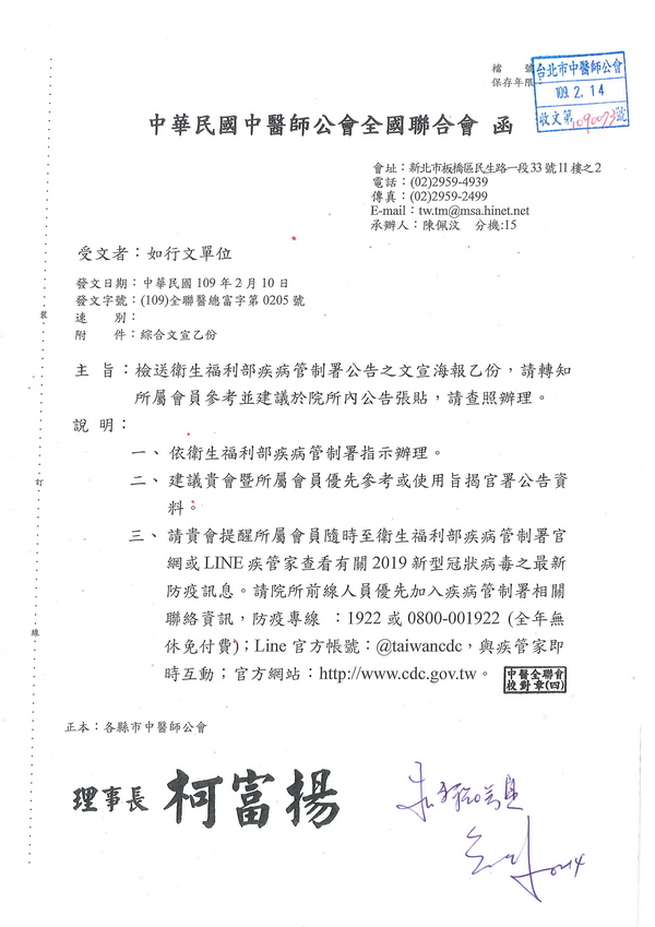 | 台北市中醫師公會 官網:http://www.tpcma.org.tw 地址:台北市中正區青島西路11號3樓 E-mail:tp.cma@msa.hinet.net 電話:(02)2314-3456(代表號) 傳真:(02)2314-8181 |