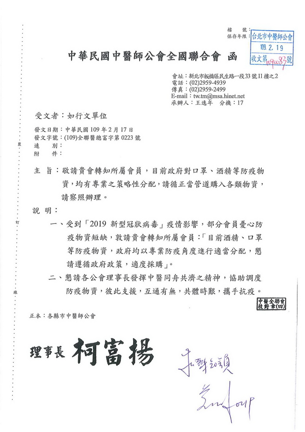 | 台北市中醫師公會 官網:http://www.tpcma.org.tw 地址:台北市中正區青島西路11號3樓 E-mail:tp.cma@msa.hinet.net 電話:(02)2314-3456(代表號) 傳真:(02)2314-8181 |