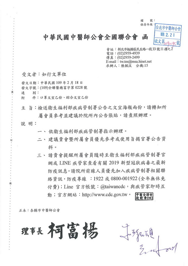 | 台北市中醫師公會 官網:http://www.tpcma.org.tw 地址:台北市中正區青島西路11號3樓 E-mail:tp.cma@msa.hinet.net 電話:(02)2314-3456(代表號) 傳真:(02)2314-8181 |