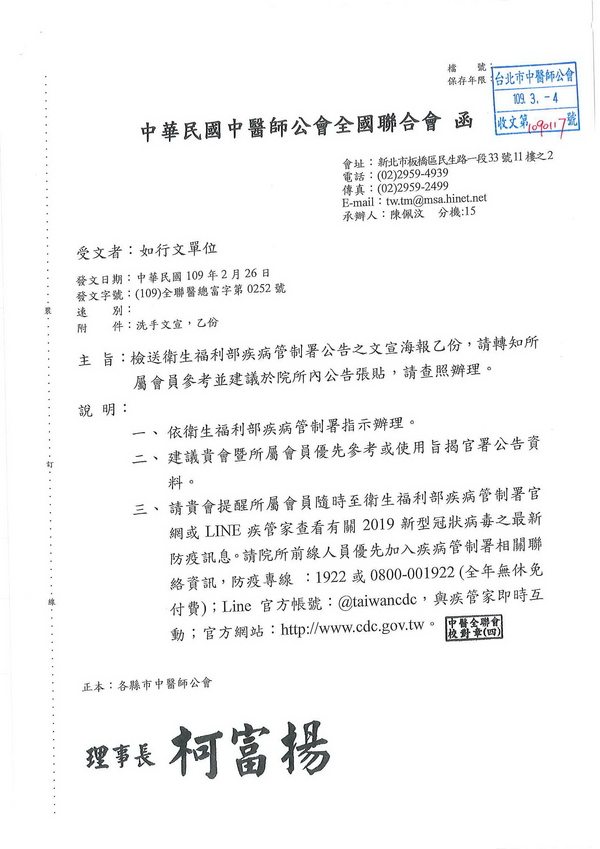 | 台北市中醫師公會 官網:http://www.tpcma.org.tw 地址:台北市中正區青島西路11號3樓 E-mail:tp.cma@msa.hinet.net 電話:(02)2314-3456(代表號) 傳真:(02)2314-8181 |