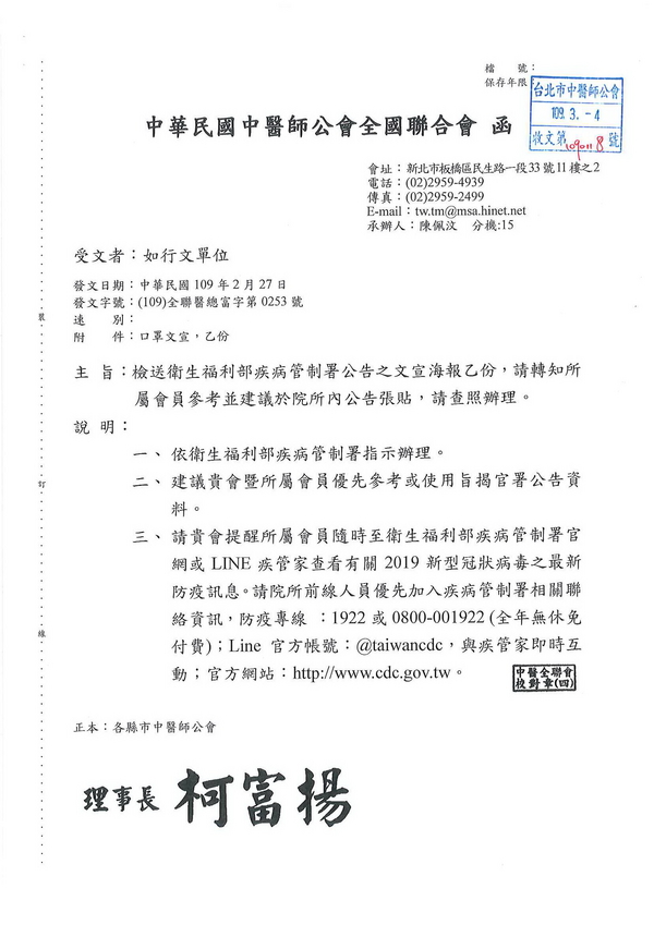 | 台北市中醫師公會 官網:http://www.tpcma.org.tw 地址:台北市中正區青島西路11號3樓 E-mail:tp.cma@msa.hinet.net 電話:(02)2314-3456(代表號) 傳真:(02)2314-8181 |