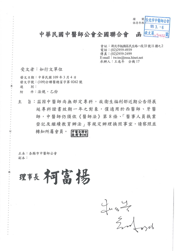 | 台北市中醫師公會 官網:http://www.tpcma.org.tw 地址:台北市中正區青島西路11號3樓 E-mail:tp.cma@msa.hinet.net 電話:(02)2314-3456(代表號) 傳真:(02)2314-8181 |