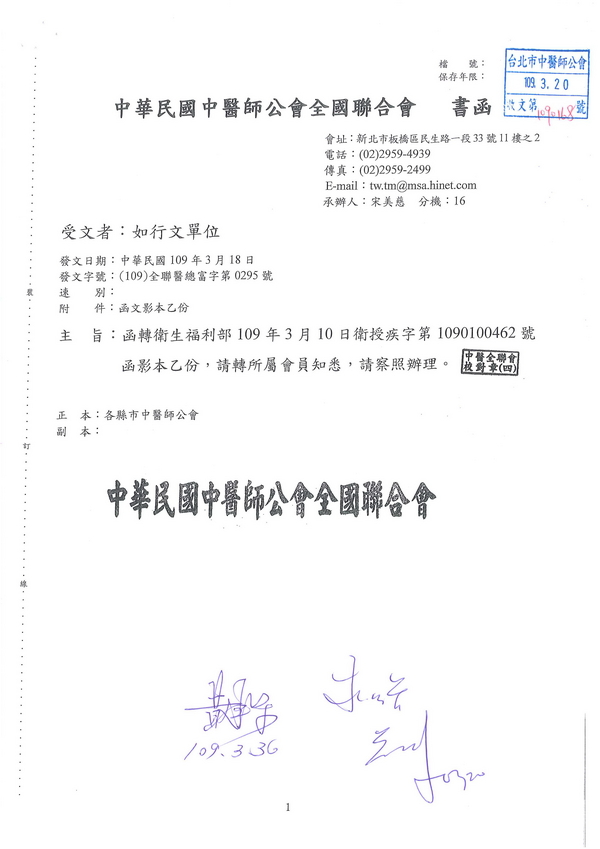 | 台北市中醫師公會 官網:http://www.tpcma.org.tw 地址:台北市中正區青島西路11號3樓 E-mail:tp.cma@msa.hinet.net 電話:(02)2314-3456(代表號) 傳真:(02)2314-8181 |