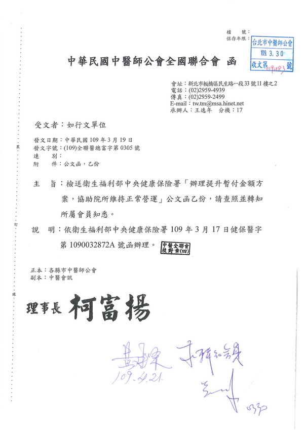 | 台北市中醫師公會 官網:http://www.tpcma.org.tw 地址:台北市中正區青島西路11號3樓 E-mail:tp.cma@msa.hinet.net 電話:(02)2314-3456(代表號) 傳真:(02)2314-8181 |