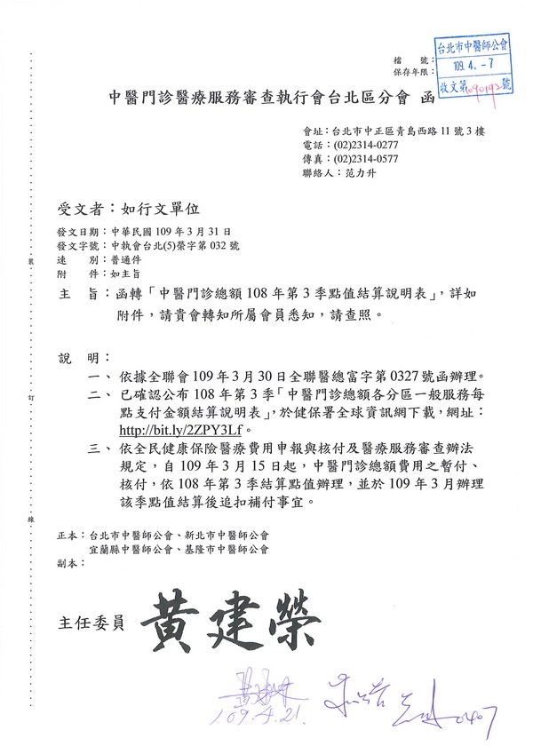 | 台北市中醫師公會 官網:http://www.tpcma.org.tw 地址:台北市中正區青島西路11號3樓 E-mail:tp.cma@msa.hinet.net 電話:(02)2314-3456(代表號) 傳真:(02)2314-8181 |
