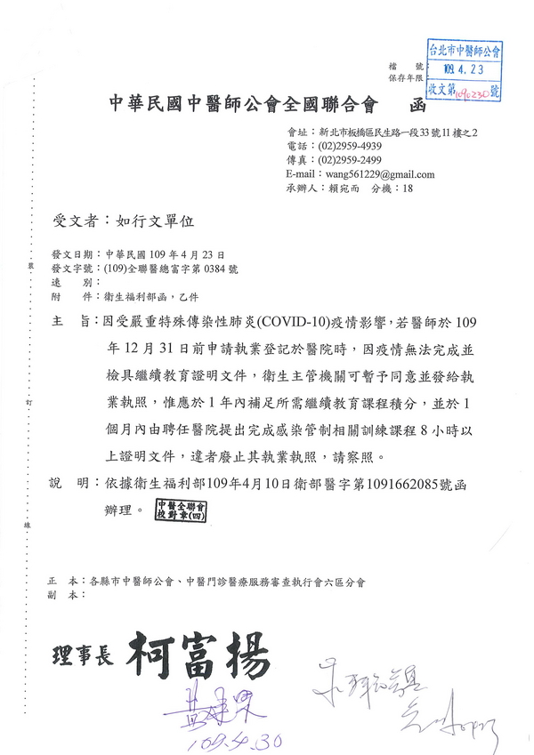 | 台北市中醫師公會 官網:http://www.tpcma.org.tw 地址:台北市中正區青島西路11號3樓 E-mail:tp.cma@msa.hinet.net 電話:(02)2314-3456(代表號) 傳真:(02)2314-8181 |