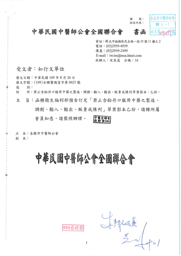 | 台北市中醫師公會 官網:http://www.tpcma.org.tw 地址:台北市中正區青島西路11號3樓 E-mail:tp.cma@msa.hinet.net 電話:(02)2314-3456(代表號) 傳真:(02)2314-8181 |